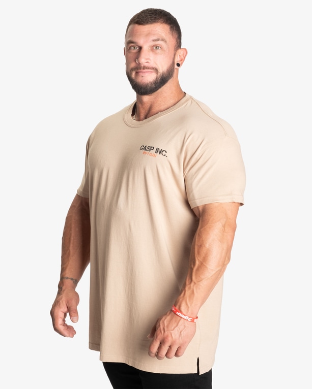 Modellen har något längre längd än en standard-T-shirt. Ärmarna är något kortare och passformen är avslappnad runt midjan men mer åtsittande över axlar och bröst, vilket skapar en kraftfull och atletisk silhuett.