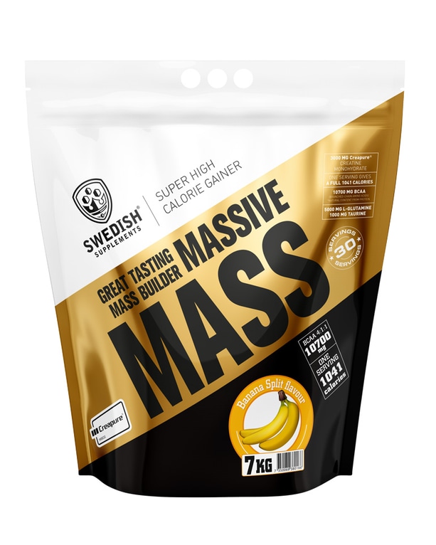 Swedish Supplements Massive Mass är den perfekta återhämningsdrycken för muskeltillväxt. Just direkt efter träningen, när både du och musklerna är slutkörda, har man ett gyllene tillfälle att vända kroppen från ett katabolt till anabolt läge. Därför innehåller Swedish Supplements Massive Mass en kombination av komplexa kolhydrater, fria aminosyror och vassleprotein – som snabbt tillför kroppen den energi och byggstenar som de utpumpade musklerna behöver. Den långsamma proteinkällan, micellärt kasein, ser till att du aldrig går tom på energi och att musklerna förses med byggstenar i upp till 5 timmar efter intaget. Varje portion, som innehåller över 1000 kcal, förser även kroppen med viktiga vitaminer och mineral som behövs för flera viktiga funktioner – såsom normal proteinsyntens och normal muskelfunktion.