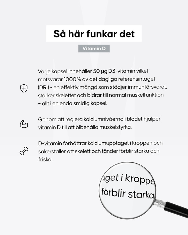 - Vitamin D3 – den form av D-vitamin som kroppen lättast tillgodogör sig.