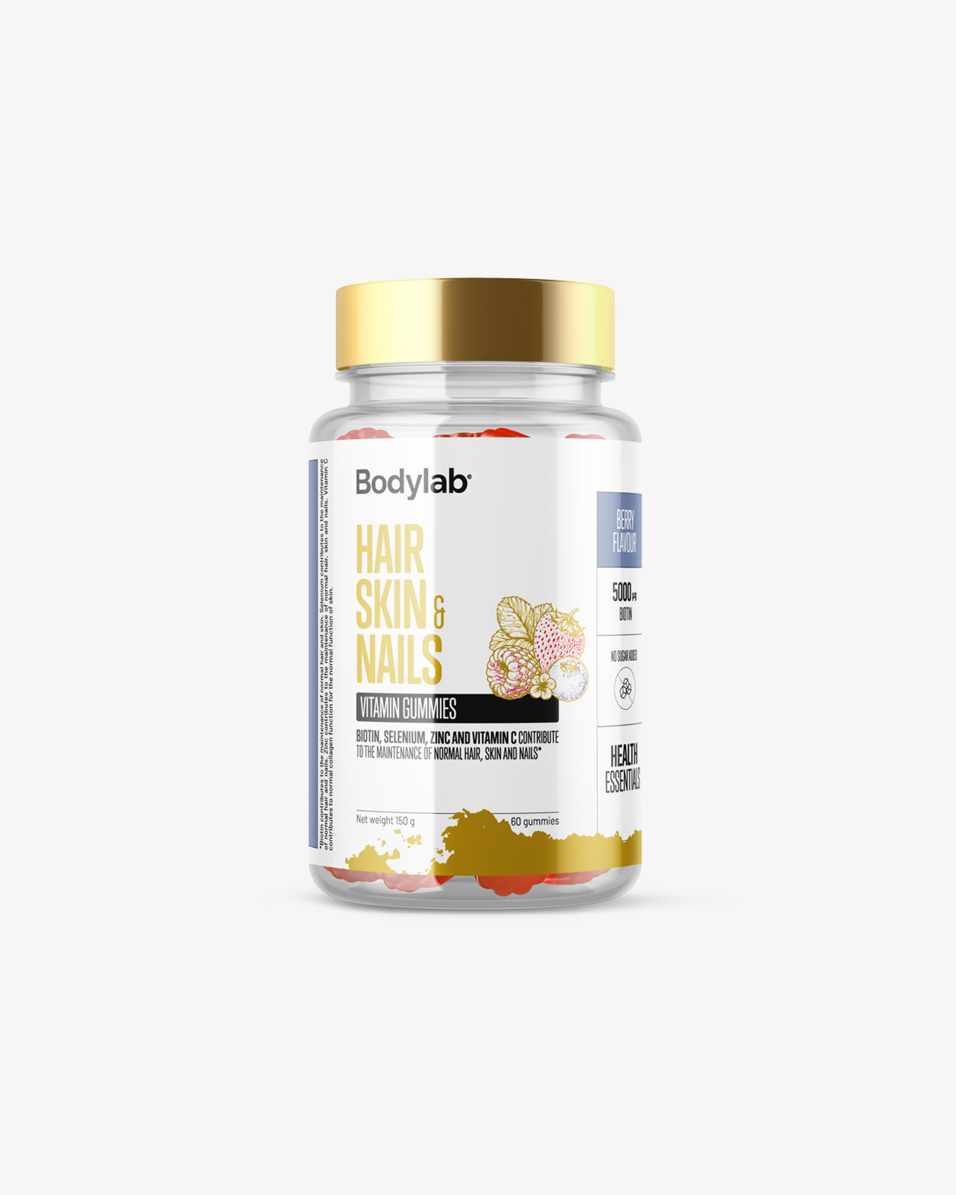 Mjuk och fruktig gummy från Bodylab med vitaminer och mineraler som bidrar till att vårda hud, hår och naglar – utan tillsatt socker.