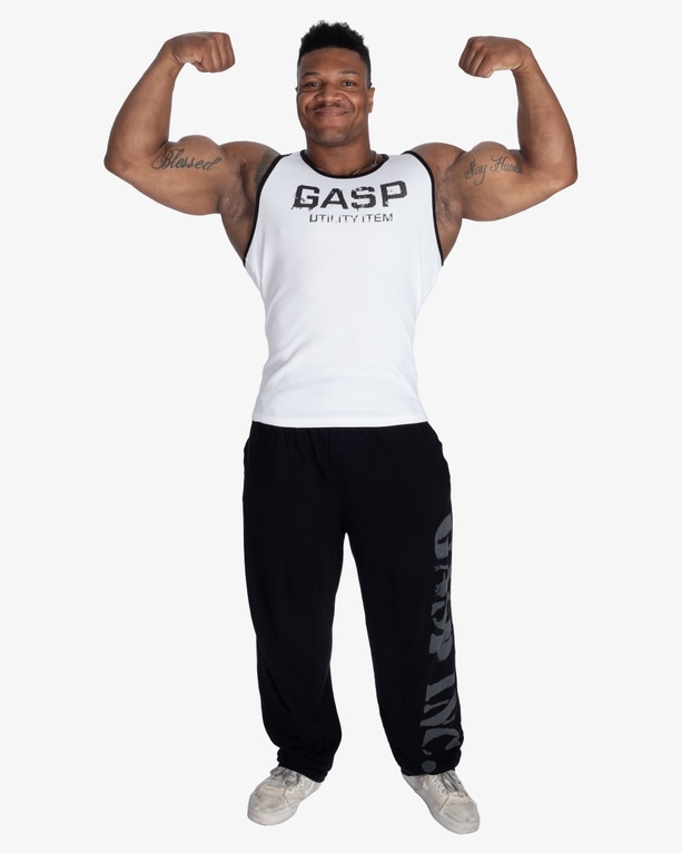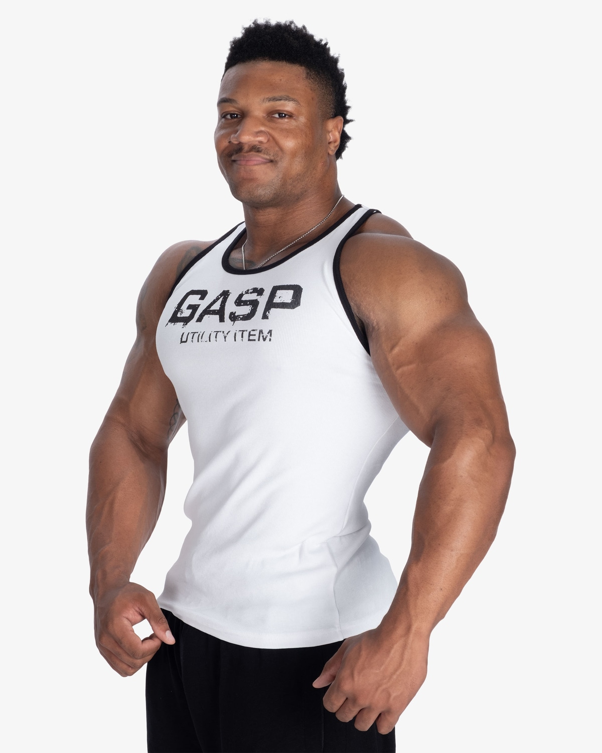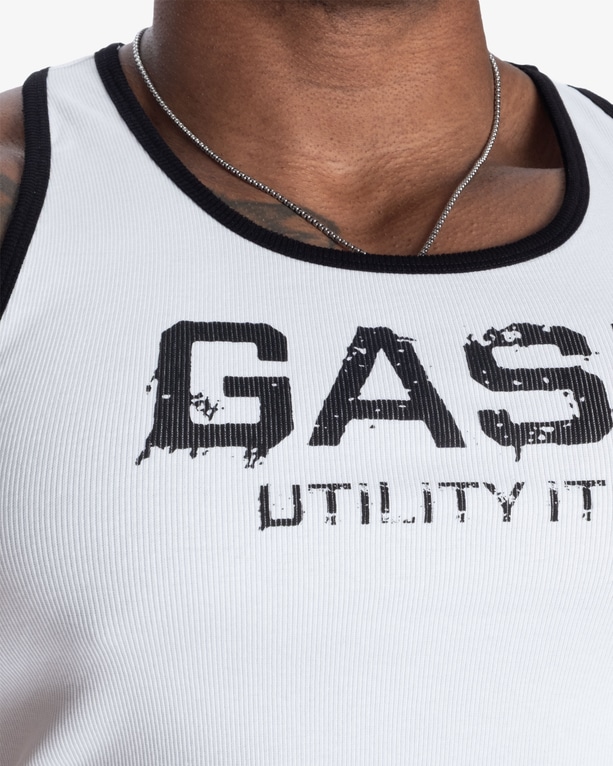 Linnet är tillverkat i ett ribbat material av bomull och lycra som ger en följsam och elastisk passform som sitter säkert genom tunga träningspass och många tvättar. Råa kanter och tydliga GASP tryck över bröstet och i nacken ger en kompromisslös känsla med klassisk bodybuilding attityd.