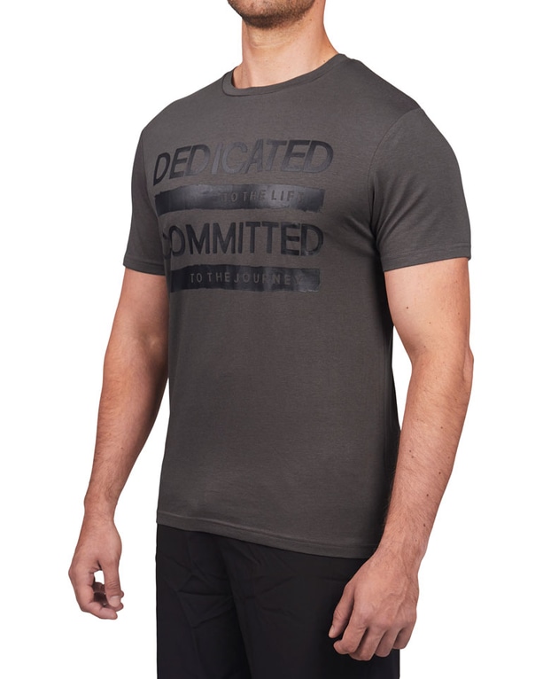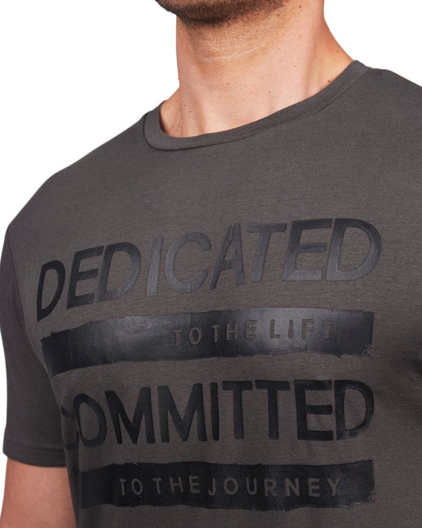 En tränings t-shirt som kommer bli din nya favorit att träna i och hjälpa dig att prestera som bäst. Den har ett material som håller dig sval genom hela träningspasset och sin mjukhet som gör den väldigt bekväm på kroppen. En atletisk och smickrande passform och sitter tight över axlar, bröst och armar. Specialtryck på bröstet med texten Dedicated to the lift Committed to the journey.
