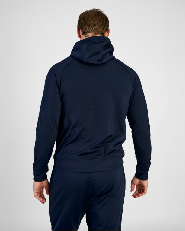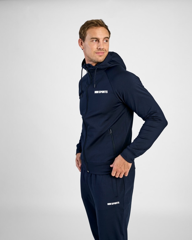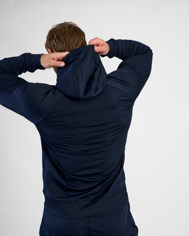 En träningshoodie till herr i samma sköna material som Loose Pants. Ett lätt och mjukt material som andas och transporterar bort fukt. Den har en tightare passform och en dragkedja framtill samt en hög krage där dragkedjan går ända upp. Fickor framtill som är försedda med dragkedja, så att mobil eller nycklar kan förvaras säkert.