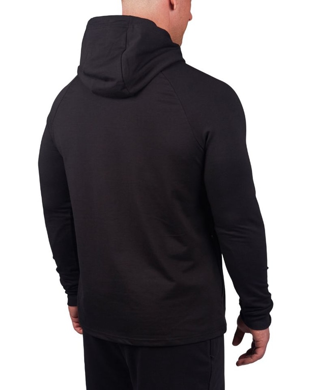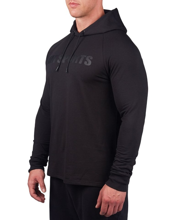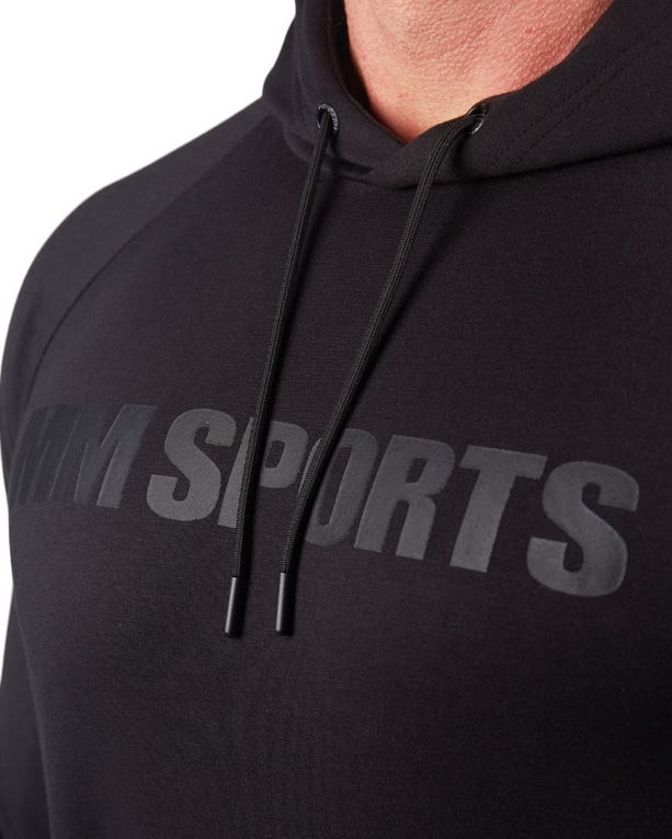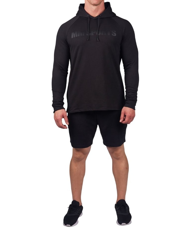 Träningshoodie med en atletisk passform och raglanärmar som framhäver vältränad fysik. Den är tillverkad i tunn bomullsblandning som gör den skön att bära både till gymmet som till vardags. Fodrad huva med dragsko. Ficka på ena sidan med dold dragkedja. MM Sports tryck framtill på bröstet.