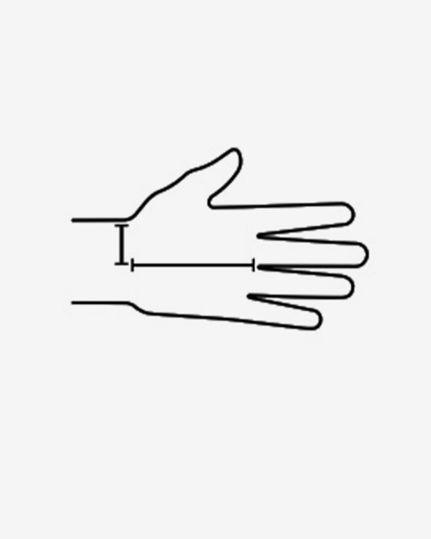 Instruktioner: Mät avståndet från handens bas till kanten av handen mellan lillfingret och ringfingret. Lägg till hälften av handledens bredd och jämför med intervallet nedan för att välja rätt storlek.