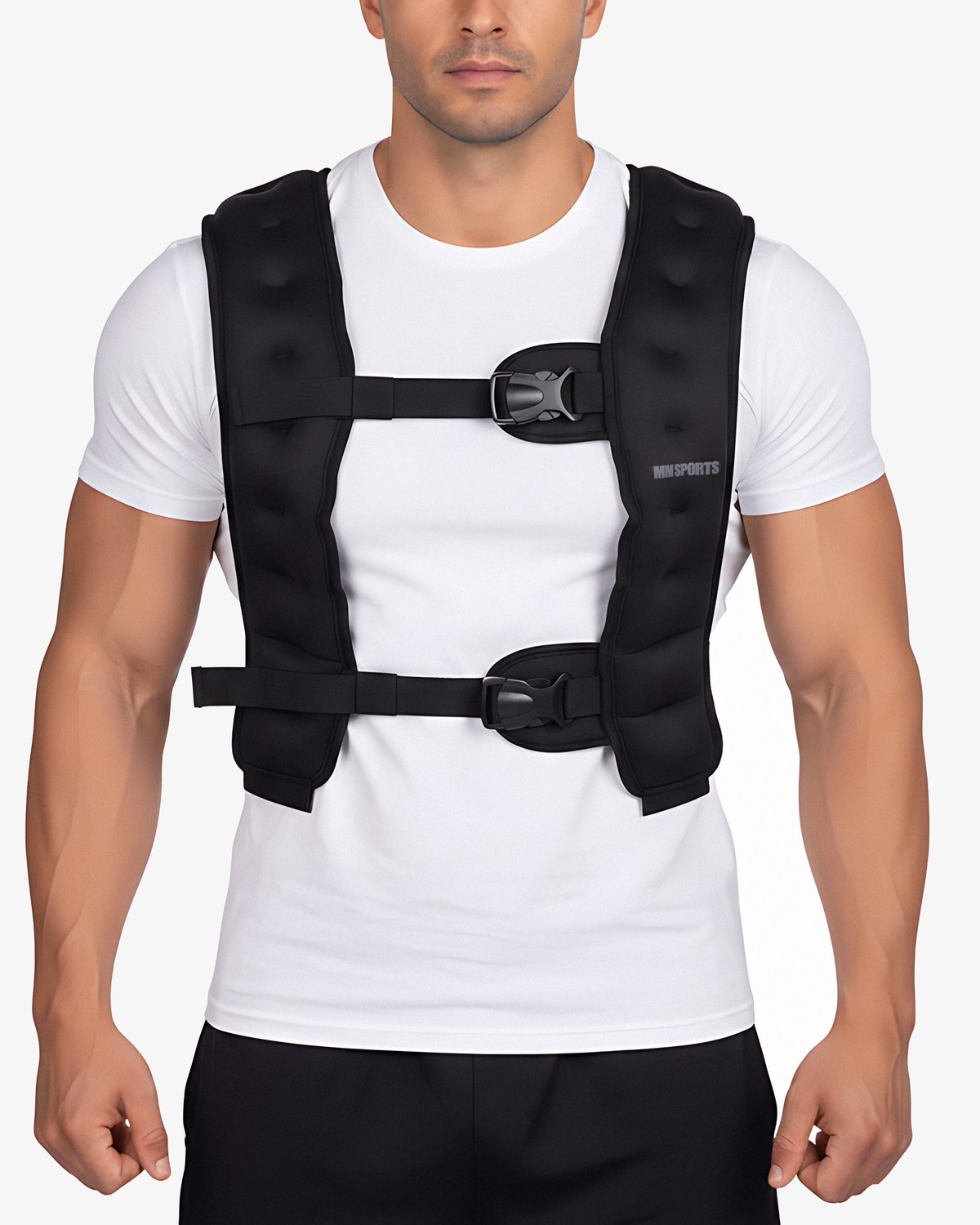 Med MM Sports viktväst kan du märkbart förbättra båda styrka och kondition. Träningsvästen går med hjälp av spännen att anpassa efter just din kroppsstorlek och är perfekt som extra vikt när du springer, cyklar eller vid styrkeövningar som tex armhävningar, dips, utfallssteg etc