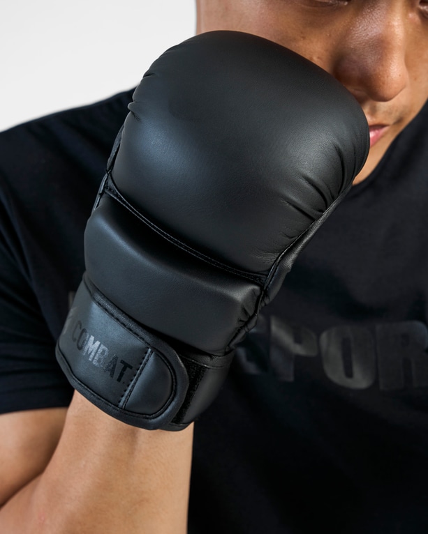 MM Combat Sparring Gloves i helsvart Black/Black-design – en stilren, följsam och slitstark handske speciellt framtagen för sparring och kampsportsträning. Handsken är tillverkad i högkvalitativt konstläder som ger lång hållbarhet och enkel skötsel, samtidigt som den behåller sitt eleganta utseende över tid.