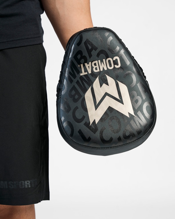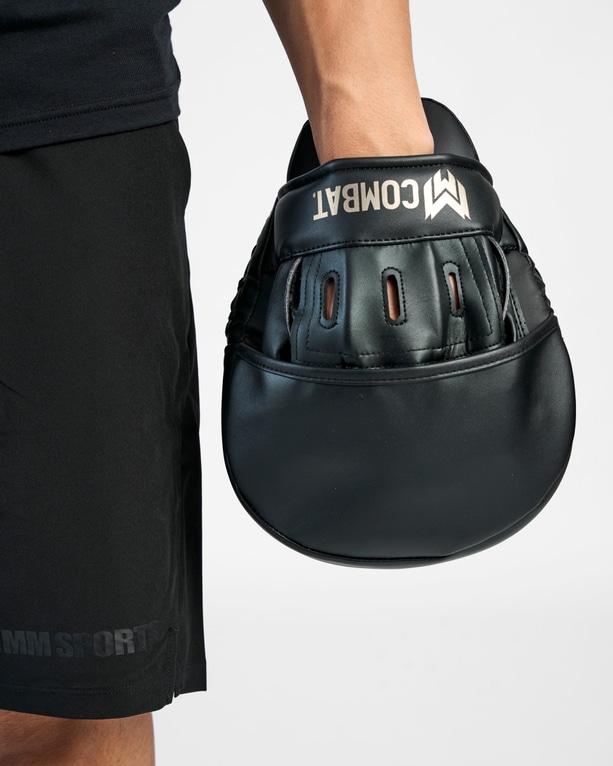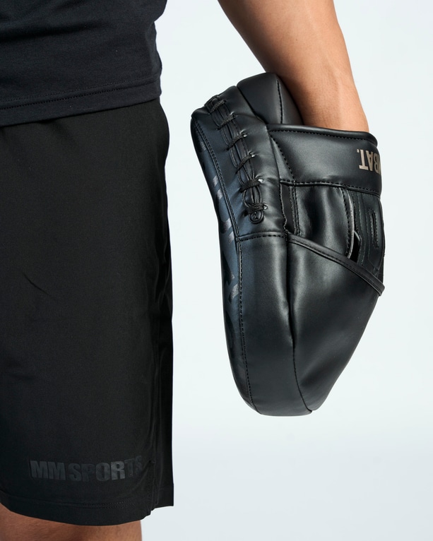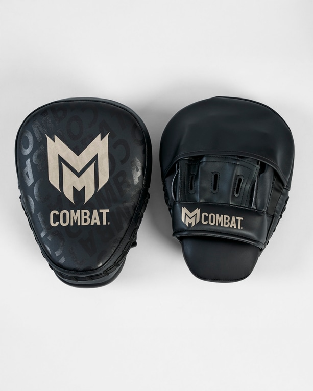 MM Combat Focus Mitts i Black/Gold-design – ett par slitstarka och bekväma mittsar i konstläder, utvecklade för effektiv träning med hög komfort och stabilitet. De säljs i par och kommer i en universell storlek som passar de flesta tränare och utövare.