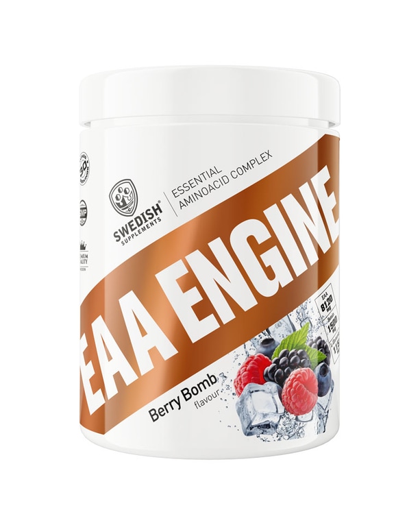 EAA Engine från Swedish Supplements är en noga sammansatt blandning av 8 essentiella aminosyror EAA dvs aminosyror som måste tillföras genom födan eftersom kroppen inte själv kan syntetisera dem. Aminosyrorna finns i så kallad fri form dvs de behöver inte smältas av kroppen på samma sätt som med ett protein utan kan tas upp direkt i blodet. Om någon eller några av de essentiella aminosyrorna saknas i kroppen blir det en faktor som begränsar proteinsyntesen och detta kan då försämra muskelns anpassning till träning, med ökad muskelnedbrytning och en negativ inverkan på ett antal metaboliska vägar som följd. Ett tillskott av EAA fyller tomrummet och behåller din kropp i en anabol uppbyggande status.