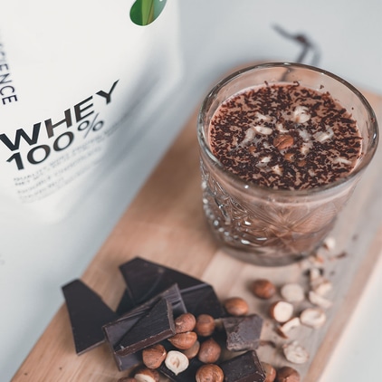 Proteinpulver med smak av choklad och hasselnöt. Innehåller sötningsmedel. Innehåller laktasenzym.